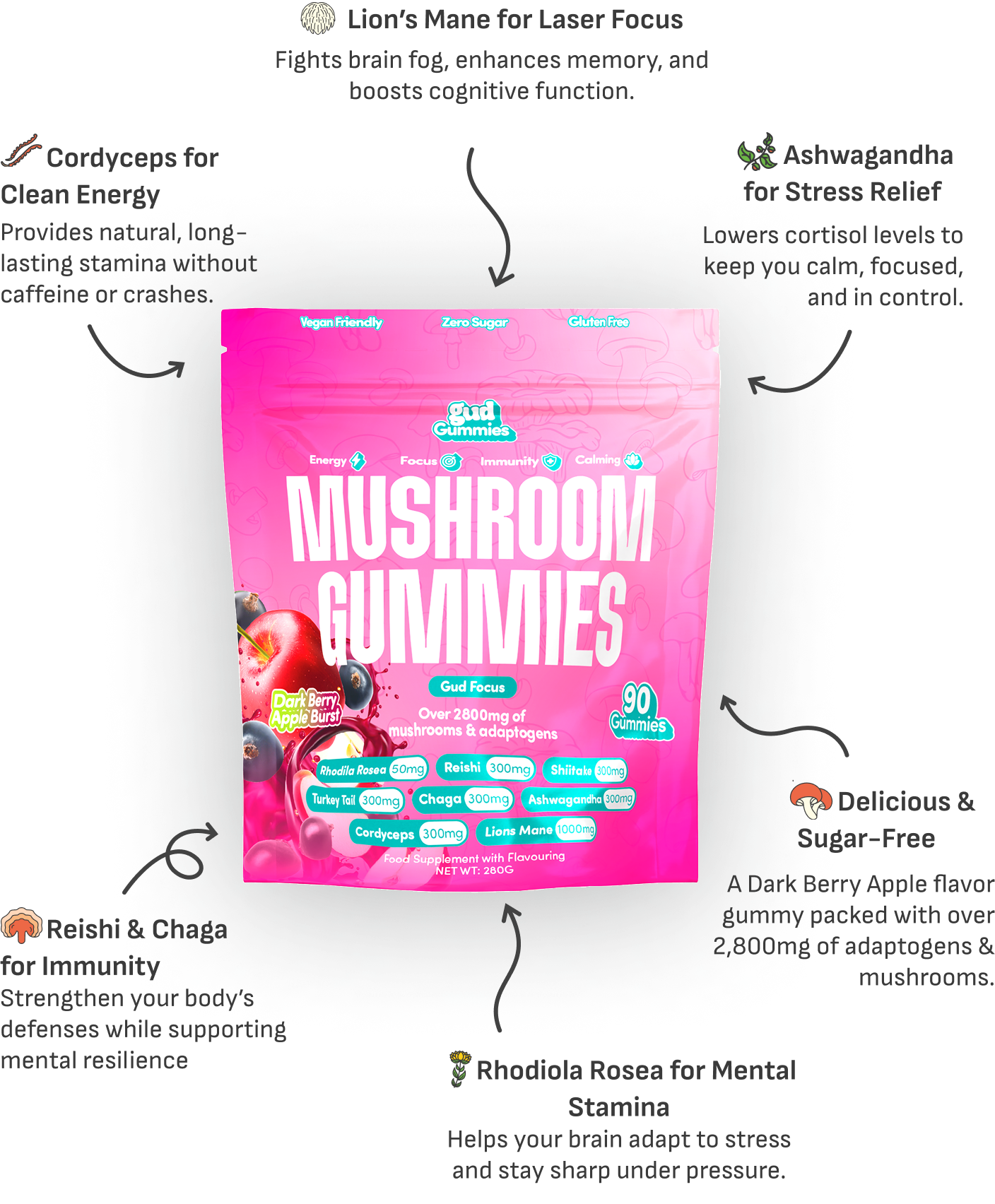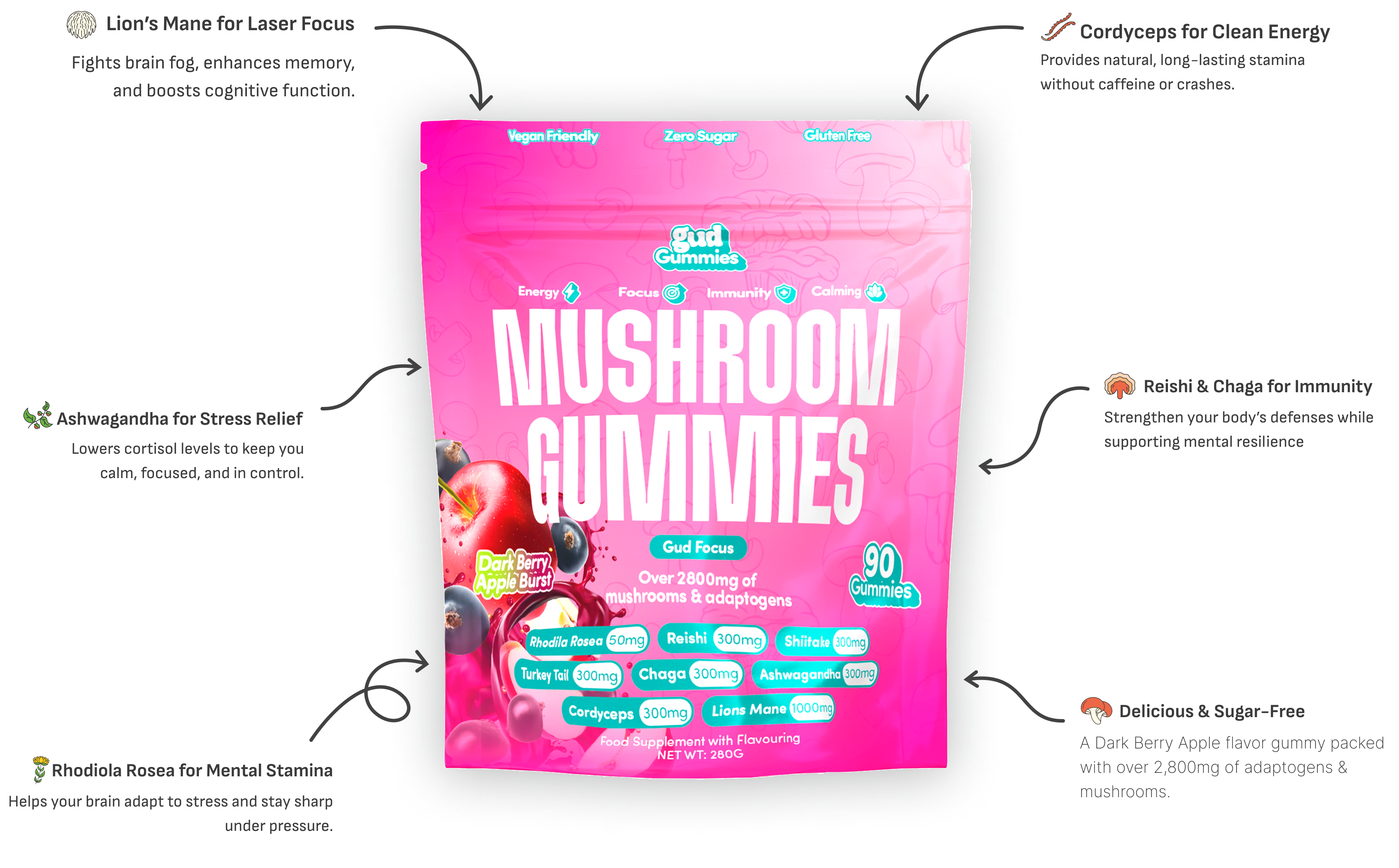 No bitter mushroom taste—just a juicy berry burst in every bite! Zero sugar, artificial sweeteners, or nasties—just clean, effective ingredients.